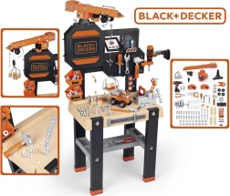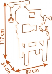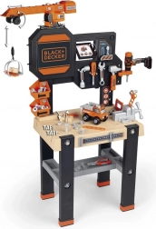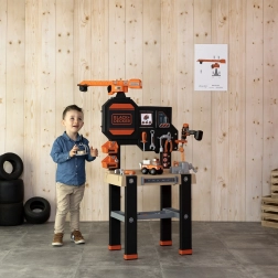 Bancul de lucru pentru copii cu macara BLACK+DECKER de la SMOBY transformă camera într-un mic atelier. Macaraua funcțională ajută la mutarea pieselor de construcție, iar accesoriile bogate includ o bormașină/înșurubător mecanic, o șurubelniță, un ciocan, un fierăstrău, un clește și o menghină. Sunt incluse și piese pentru un camion de asamblat, șuruburi, cuie și piulițe, astfel încât copiii pot descoperi mereu noi sarcini și scenarii de joc.