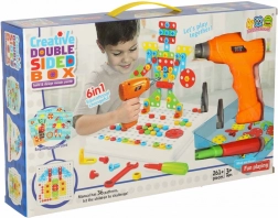 Setul de construcție cu placă mozaic le permite copiilor, cu ajutorul bormașinii de jucărie, al șurubelniței și al cheii, să înșurubeze șuruburi colorate și să creeze diverse imagini și modele 3D. Dați viață imaginației copilului – singura limită este creativitatea micului constructor.