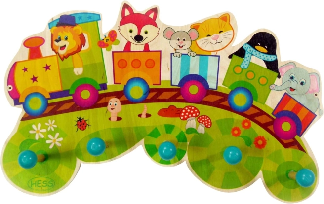 Cuier colorat captivant pentru camera copiilor sau hol cu motiv de tren și cinci cârlige pentru agățarea hainelor. Fabricat din lemn ecologic, vopsit cu vopsele ecologice.