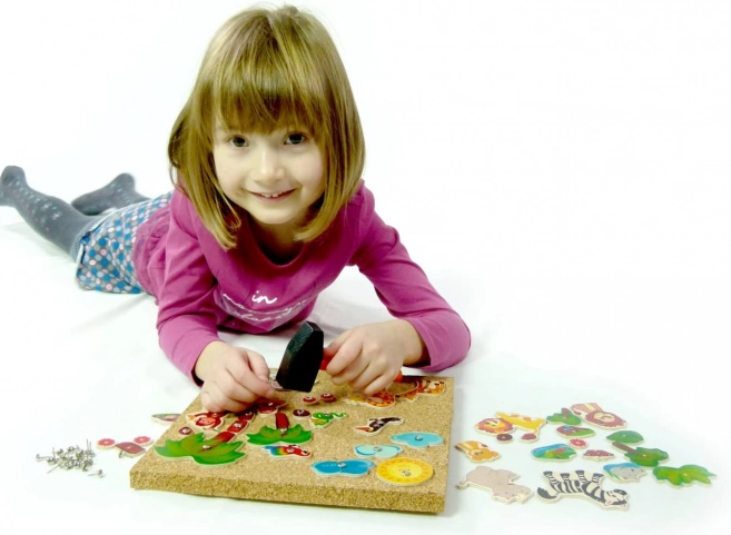 Acest joc de bătut cuie din lemn, de înaltă calitate, oferă copiilor ore de distracție cu sens. Datorită formelor variate din placaj imprimat, micii creatori pot alcătui propriile scene safari, dezvoltând creativitatea și gândirea logică. Suportul din plută asigură baterea cuielor în siguranță și confort, iar capetele semirotunde mari ale cuielor facilitează manipularea.