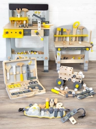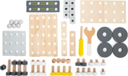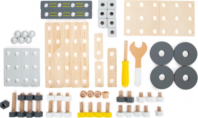Pachetul include accesorii bogate: lamele și plăci de construcție cu orificii pre-găurite, cuburi, roți, adaptoare pentru roți, distanțiere și două unelte din lemn – cheie și șurubelniță. Totul se păstrează ordonat în cutia practică, astfel încât nicio piesă să nu se piardă.