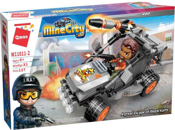 Bucurați-vă de aventuri cu Qman MineCity Motocart Al Evasărilor! Acest set de construcție oferă 127 de piese și un joc creativ pentru copii de la 6 ani, compatibil cu alte seturi de construcție.