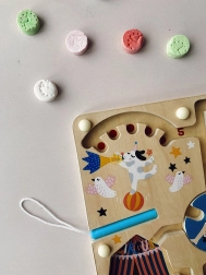 Labirintul magnetic VILAC aduce copiilor de la 2 ani lumea circului în culorile delicate ale lui Michelle Carlslund. Cu stiloul magic cu magnet, ei deplasează bilele pe trasee, întâlnesc acrobați, animale și clovni, iar la final readuc fiecare bilă la locul corect, după culoare și număr. Jocul dezvoltă în mod natural concentrarea și răbdarea.