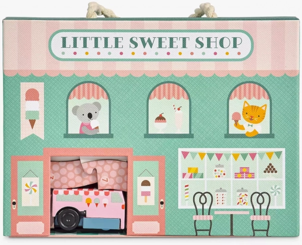- Conținutul setului: cofetărie cu două fețe, mașină de înghețată din lemn cu mecanism de întoarcere, 8 piese de pistă, 10 piese de joc suplimentare