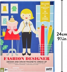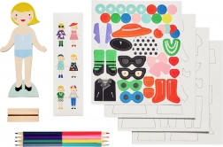 Jucăria include o figură magnetică cu suport din lemn, 36 de piese magnetice de îmbrăcăminte, 4 creioane duble și 35 de autocolante, permițând crearea a peste 100 de ținute diferite. Copiii își pot exprima creativitatea și dezvolta imaginația datorită diversității pieselor și posibilităților de combinare. Cutia servește nu doar ca spațiu de depozitare, ci și ca fundal plăcut pentru joc, făcând întreaga experiență complexă și estetică.
