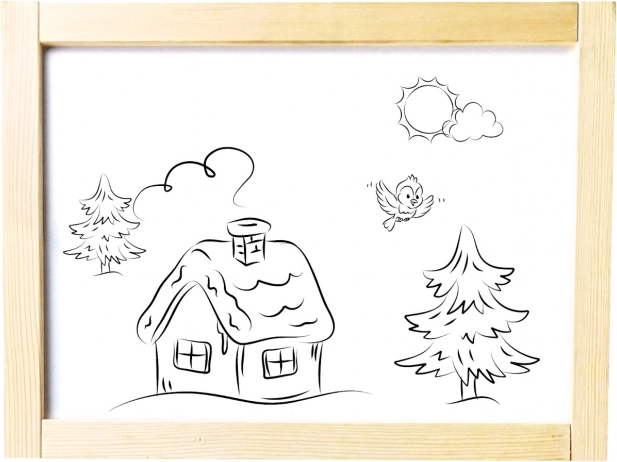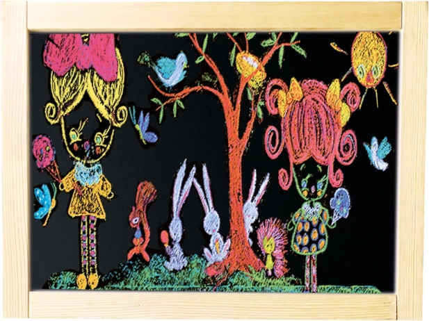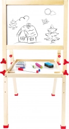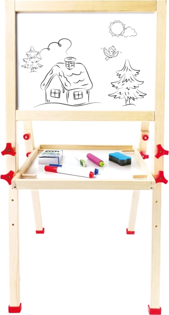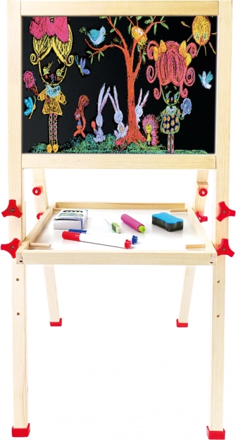 Pachetul include tot ce ai nevoie: cretă, marker, burete și câteva imagini magnetice. Tabla se poate plia rapid și depozita econom, astfel încât ocupă puțin spațiu. Cele două suprafețe de lucru permit ca doi copii să creeze simultan.