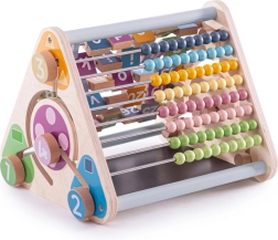 Acest triunghi activ din lemn, de înaltă calitate, aduce copiilor ore de distracție cu sens. Datorită construcției stabile și designului bine gândit, fără piese mici, este ideal pentru joaca acasă și pentru grădinițe. Copiii își exersează prin joc numărarea, recunoașterea literelor și a animalelor, coordonarea mână–ochi și creativitatea pe tabla pentru cretă.