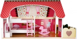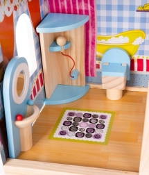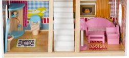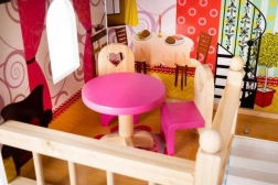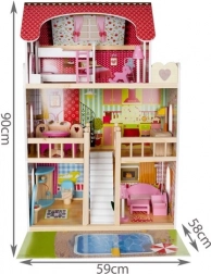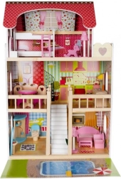 Căsuța de păpuși din lemn este o jucărie excelentă ce dezvoltă creativitatea și abilitățile sociale ale copiilor. Are trei etaje conectate prin scări albe frumoase și include total cinci camere, un balcon și o grădină cu piscină. Este dotată cu diverse elemente colorate și plăcute care asigură distracție pe termen lung.