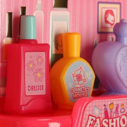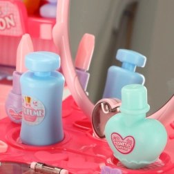 - Set bogat de accesorii: oglindă, pieptene, „uscător” pentru copii, agrafe, inele, brățări, autocolante și sticluțe care imită lacul de unghii și parfumurile.