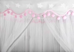 Combinația gri‑roz cu stele și pompoane decorative îi va încânta pe copii și pe părinți. Arată grozav și cu iluminat decorativ.