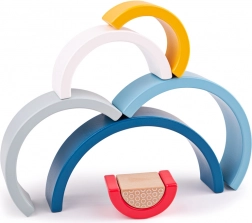 Curcubeul din lemn în culori vii oferă copiilor posibilități nesfârșite de construcție – de la poduri și tuneluri până la creații imaginative. Fiecare arcadă se potrivește precis în cealaltă, ceea ce susține coordonarea mână–ochi și îi învață pe copii să distingă mărimile și formele.