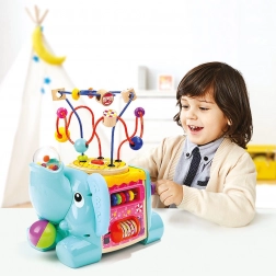 Acest cub motric multifuncțional în formă de elefant este o jucărie educativă ideală pentru cei mici. Datorită elementelor colorate și activităților variate, copiii exersează în mod natural motricitatea fină, percepția spațială și abilitățile senzoriale. Partea superioară este formată dintr-un labirint motric cu mărgele, iar lateralele sunt decorate cu roți dințate, piese glisante și alte sarcini istețe.