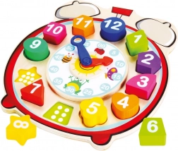 Această jucărie educativă multifuncțională din lemn îmbină un puzzle cu un ceas. Piesele colorate de forme diferite, cu cifre, se introduc în orificiile corespunzătoare, iar sub piese sunt marcate puncte pentru orientare mai ușoară și primele numărări. Acul pentru ore și cel pentru minute, ambele rotative, îi ajută pe copii să înțeleagă principiul măsurării timpului într-un mod distractiv și intuitiv.