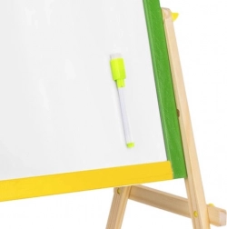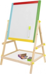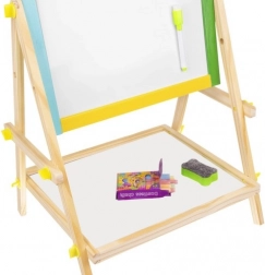 Tablă dublă din lemn pentru copii cu față neagră pentru cretă și față albă (whiteboard, ștergere la uscat) care susține creativitatea, învățarea și motricitatea fină. Rama colorată este din lemn finisat neted, iar construcția stabilă este completată de polița practică pentru accesorii. În pachet găsiți marker, burete și creioane de cretă – gata de folosit imediat.
