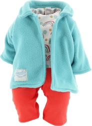 Ținuta Petitcollin Arthur transformă orice păpușă de 36 cm într-un partener de joacă elegant. Setul combină hanoracul turcoaz din fleece, bluza veselă cu model, pantalonii scurți roșii și căciulița asortată – împreună creează o ținută atractivă și confortabilă pentru aventurile zilnice.