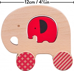 Puiul de elefant roșu, detașabil, se introduce în deschiderea din mijlocul elefantului. Copiii își exersează prinderea, logica și coordonarea în timp ce îl trag pe roți.