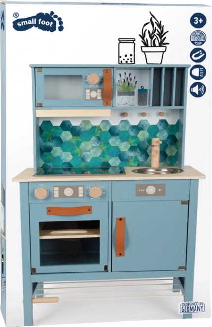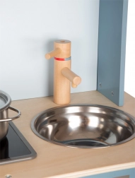 Bucătăria de copii în nuanța albastru fumuriu, cu mânere din piele stilate, oferă un sentiment realist de gătit.