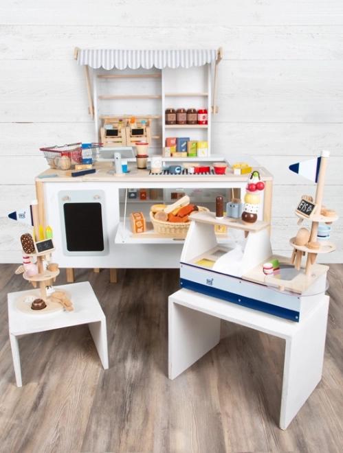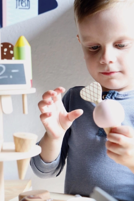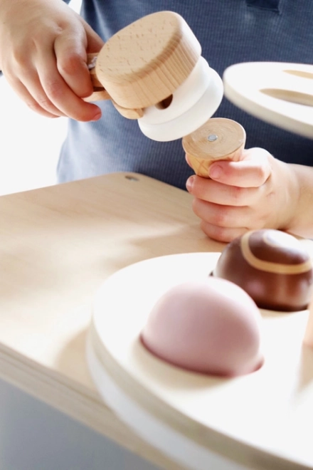 Suport de înghețată din lemn Fresh este jucăria perfectă pentru micii vânzători. Oferă varietate de delicatese de înghețată și o lingură magnetică care asigură manipulare sigură și ușoară. Cu aspectul său natural, stimulează jocul imaginativ.