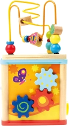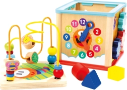 Acest cub motric colorat din lemn oferă copiilor de la 12 luni numeroase modalități de a se juca și a învăța în același timp. Cu ajutorul ceasului cu limbi, copiii se familiarizează într-un mod ludic cu noțiunea de timp, labirintul cu mărgele dezvoltă prinderea și coordonarea, iar celelalte laturi ale cubului exersează logica, formele și culorile.