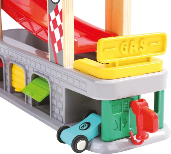 Trei garaje cu uși rabatabile și stație de alimentare susțin scenarii pline de imaginație – de la opriri la service până la parcare și sortarea mașinuțelor.