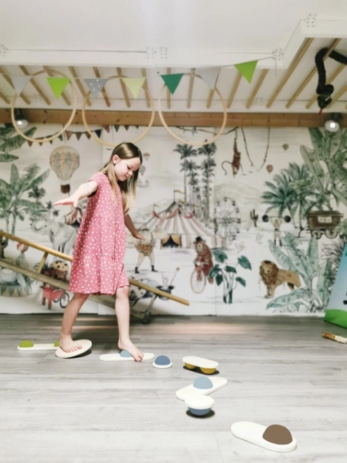 Această jucărie nu este doar distractivă, ci și potrivită pentru scopuri terapeutice, ajutând la dezvoltarea condiției fizice, a echilibrului și a coordonării. Formele fluide și designul simplu cu elemente din lemn natural fac din aceste pietre un accesoriu estetic plăcut pentru orice cameră.