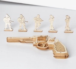 Pe lângă revolver, pachetul include și cinci figurine din lemn care servesc drept ținte. De asemenea, sunt incluse gloanțe de cauciuc, pe care revolverul le poate trage la o distanță de până la cinci metri. Acest model oferă nu doar distracție, ci poate fi folosit și ca element decorativ pe biroul sau pe rafturile dumneavoastră.