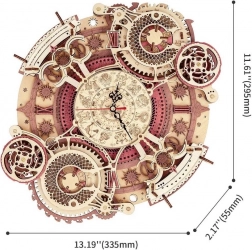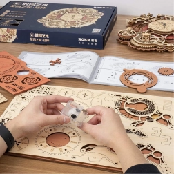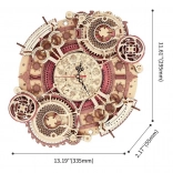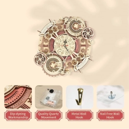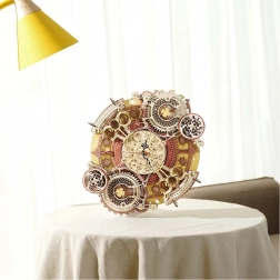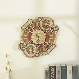 Descoperiți arta ceasornicariei cu puzzle-ul nostru mecanic de lemn 3D. Acest model se remarcă prin complexitatea și execuția să precisă, atrăgând atenția tuturor pasionaților de proiecte DIY și design steampunk. Ideal de agățat pe perete, acest model oferă utilizare estetică și funcțională, fiind alimentat de ceasul electric și calendarul decorativ.