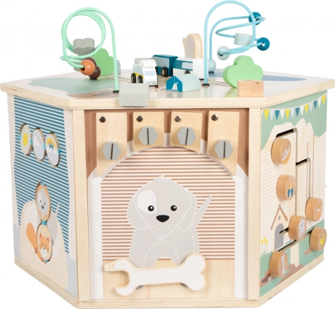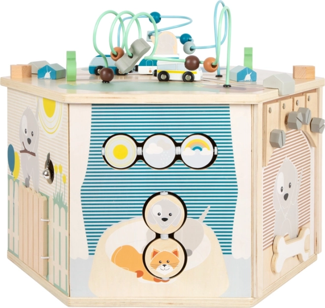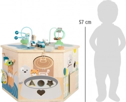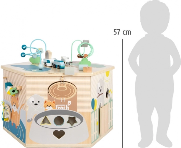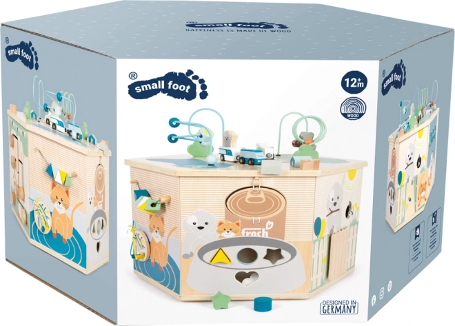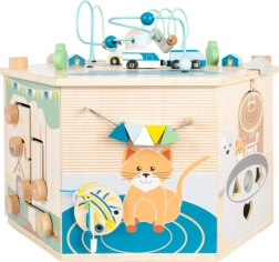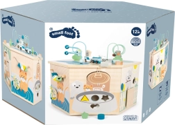 Cubul motric interactiv SMALL FOOT Pets XXL este un centru educațional bine gândit pentru cei mici. Cele opt panouri de joc dezvoltă motricitatea fină, simțul tactil și percepția auditivă, iar datorită ilustrațiilor detaliate le prezintă copiilor viața de zi cu zi a animalelor. Copiii descoperă aici labirint cu mărgele, joc de introdus forme, plăcuțe rotative, activitate de înșiretare / sortare a culorilor, puzzle și alte elemente interactive care susțin concentrarea și gândirea logică.