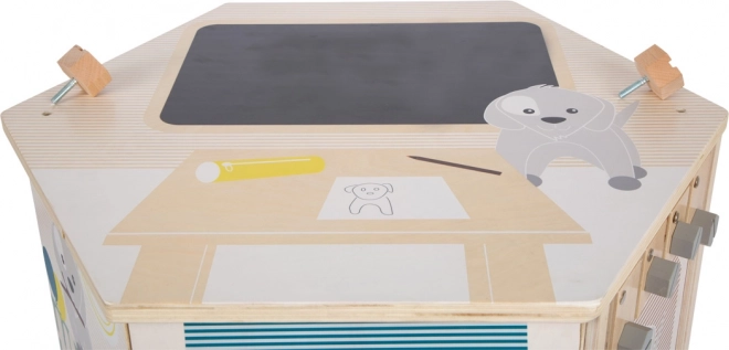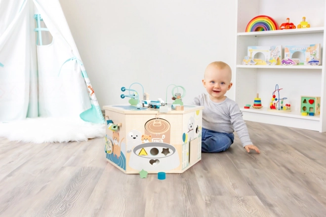 Fiecare față propune altă sarcină: labirint cu mărgele, introducerea formelor, înșiretare și sortarea culorilor, plăcuțe rotative, puzzle și clopoțel. Copiii își antrenează în mod natural motricitatea fină, coordonarea mână–ochi și percepția culorilor și a sunetelor.