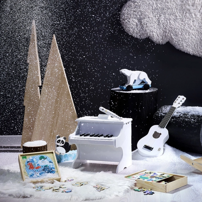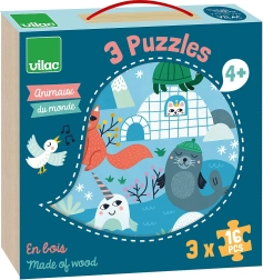 Trei puzzle-uri cu imagini tematice din savană, pădure și ghețari prezintă copiilor lumea animalelor în mediul lor natural.