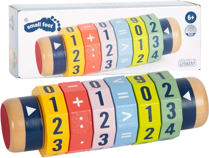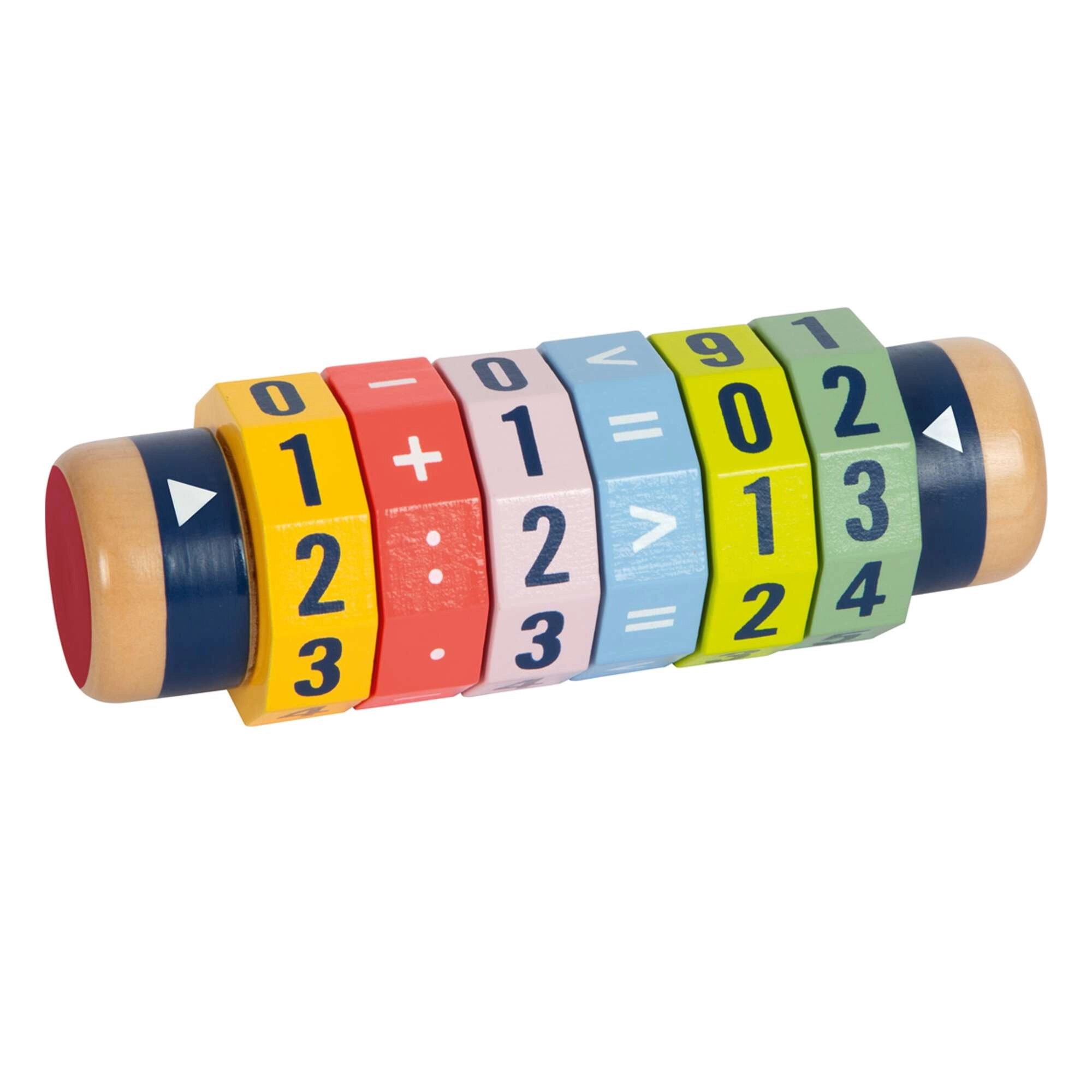 Descoperiți drumul distractiv către matematică. Cilindrul din lemn cu șase inele rotative le permite copiilor să creeze ecuații simple și mai complexe și să compare numere. Datorită culorilor vii și cifrelor evidențiate, copiii învață într-o manieră ludică și își dezvoltă motricitatea fină și capacitatea de concentrare.