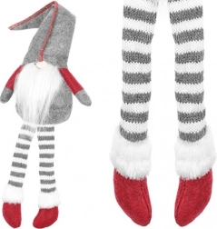 Picioarele în dungi, cu manșete pufoase și botoșei roșii, oferă decorațiunii un farmec de iarnă tipic și un caracter distractiv.