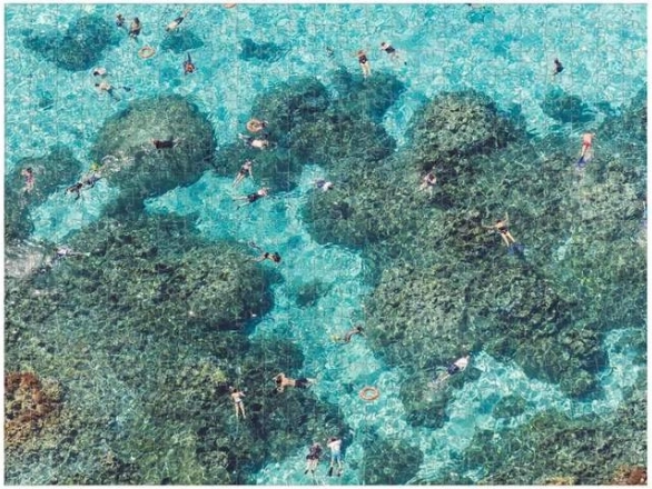 Puzzle-ul reversibil, inspirat de fotografiile aeriene iconice semnate Gray Malin, aduce o provocare atrăgătoare și, totodată, un rezultat decorativ. O față surprinde o plajă aglomerată din perspectivă aeriană, cealaltă liniștea oceanului cu stânci și înotători. Datorită finisajelor diferite (lucios/mat) recunoști ușor ce parte asamblezi.
