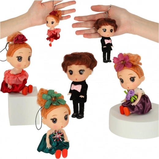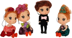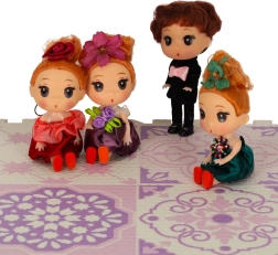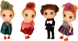 Acest frumos set de mini-păpuși este un accesoriu ideal pentru orice căsuță de păpuși. Copiii vor iubi execuția atentă și ținutele elegante – băiatul în frac cu papion roz, iar fetele în rochii în nuanțe de mov, bordo și bleumarin, completate cu o decorațiune florală pentru păr. Ținutele sunt fixate de păpuși, astfel încât nu se pierd.