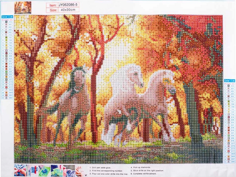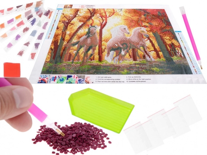 Creează un tablou mozaic unic cu setul de pictură cu diamante Cai alergători 40x30 cm. Activitate de relaxare perfectă pentru toate vârstele, set complet echipat și ideal cadou.