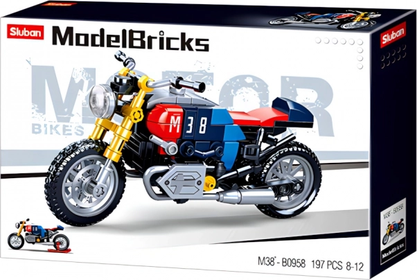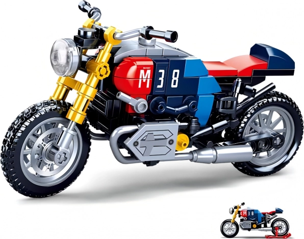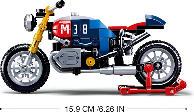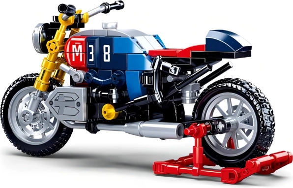 Acest model detaliat de motocicletă în stilul iconic café racer oferă o combinație captivantă de albastru, roșu și galben, cu numărul 38 evidențiat. Elemente realiste, precum roțile funcționale și eșapamentele, îl transformă într-un set de construcție de motocicletă atrăgător, atât pentru joacă, cât și pentru expunere.