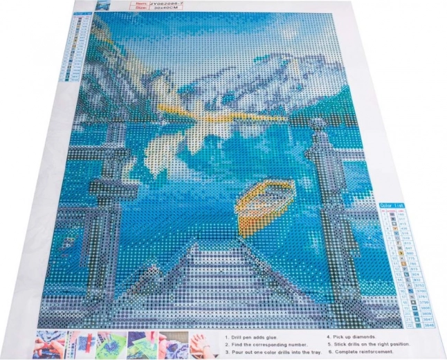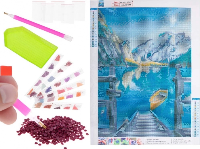 Setul include tot ce ai nevoie pentru a începe: pânza cu imagine, diamante colorate, aplicator, lipici uscat și recipient.