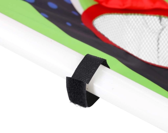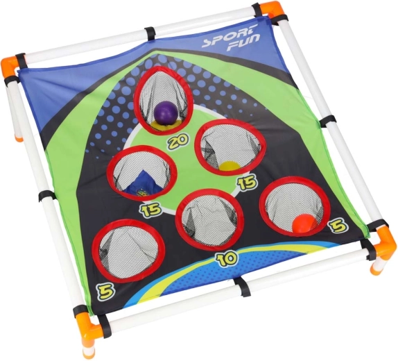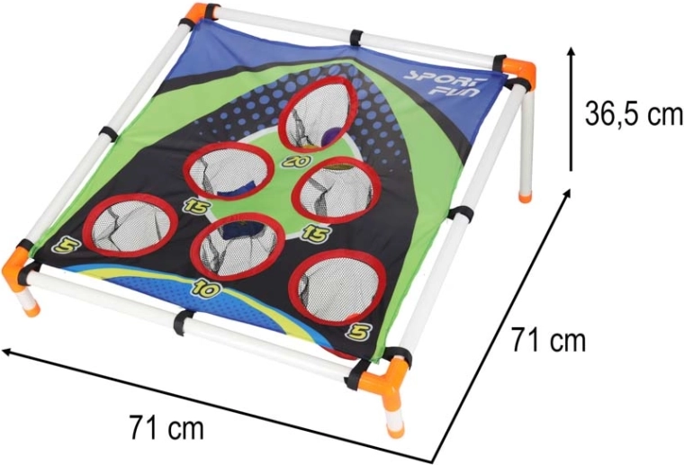 Construcția ușoară din tuburi de plastic, cu suport înclinat, asigură stabilitate, iar suprafața textilă rezistentă cu cinci până la șase orificii punctate reține săculeții și mingile în săculețe de plasă. Asamblarea este intuitivă, iar întregul ansamblu se transportă cu ușurință oriunde.