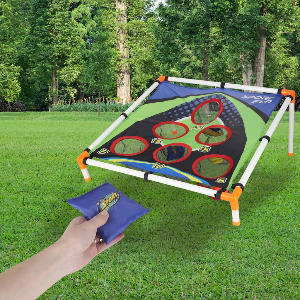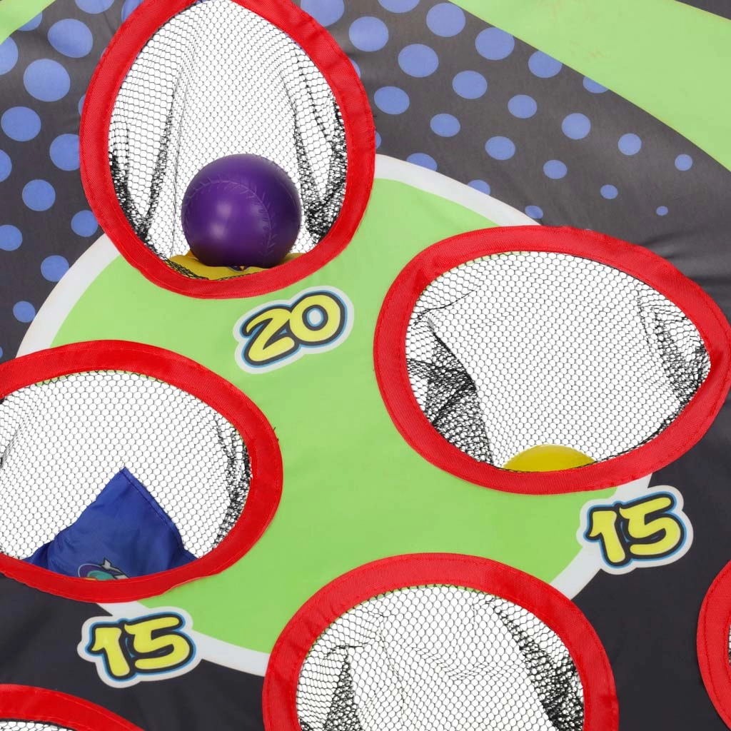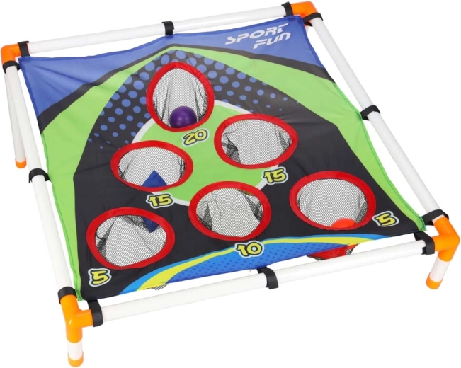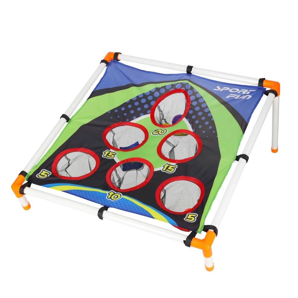 Joc distractiv de aruncare pentru copii, care dezvoltă coordonarea mână–ochi, precizia și reacțiile rapide. Cadrul ușor cu țintă înclinată și orificii numerotate oferă provocări variate de punctaj. Potrivit pentru grădină și interior, asamblare simplă și transport facil. Include atât săculeți pentru aruncat, cât și mingi din plastic.