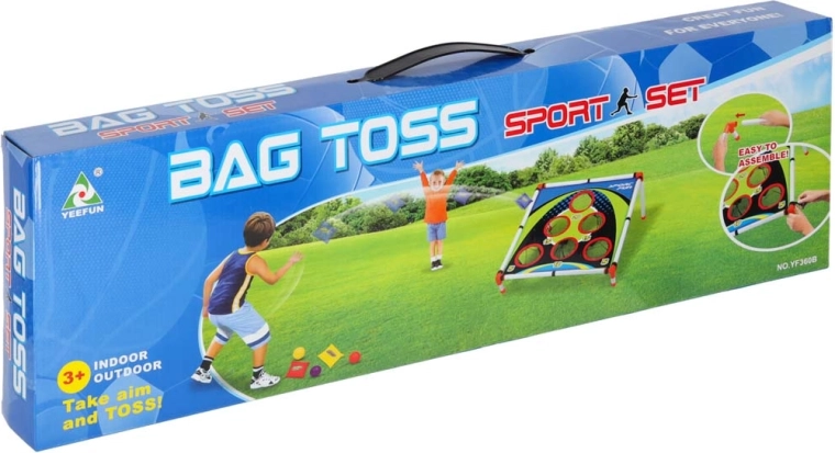 - 3 săculeți de aruncare, 3 mingi din plastic, cadru pentru țintă, țintă textilă cu orificii