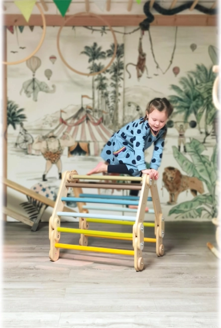 Această scară de cățărat este fabricată dintr-o combinație de placaj și lemn masiv de calitate, asigurând durabilitate și stabilitate. Datorită posibilității de decompoziție în mai multe forme, oferă oportunități largi de joacă și este de asemenea foarte compactă. Ideală pentru dezvoltarea echilibrului și a abilităților motorii ale copiilor, poate fi utilizată și în terapia fizică.