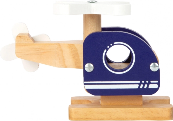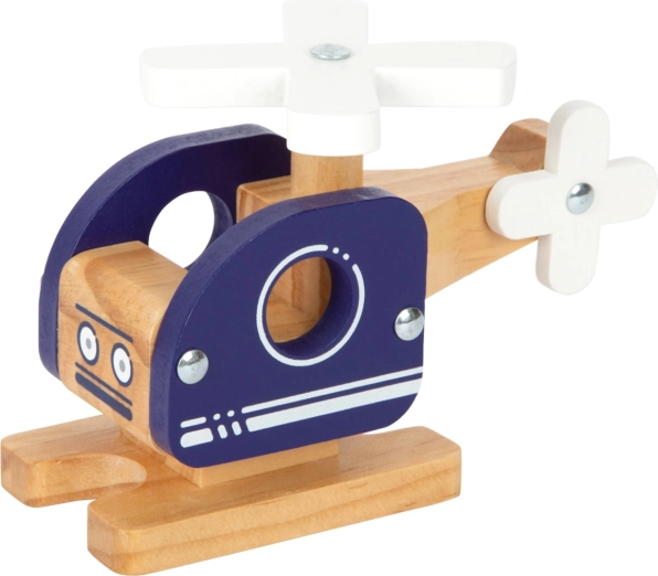 Elicopterul din lemn are un finisaj natural din lemn cu detalii albastre și albe, care îi conferă un aspect jucăuș și îl face sigur pentru copii.