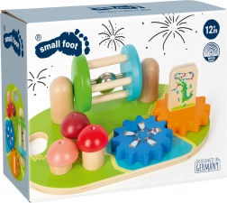 Placa din lemn oferă diverse elemente mobile precum rotițe dințate și ciuperci pentru dezvoltarea motricității fine.