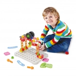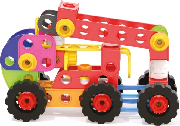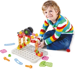 Șuruburile, piulițele și plăcuțele perforate se îmbină ușor și rezistent. Copiii pot construi mașini, tractoare, macarale și propriile modele – simplu și în siguranță.