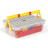 Toate piesele se depozitează în cutia solidă cu mâner. Capacul perforat servește drept suprafață de construcție – ideală acasă și în călătorii.