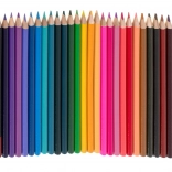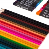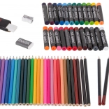 Creioane colorate, pasteluri uleioase, creioane grafit, gumă și ascuțitoare pentru desen precis, hașurare și suprafețe colorate intense.