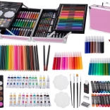 Set artistic complet într-o valiză practică roz, pentru creatori mici și mari. Găsești înăuntru tot ce îți trebuie pentru desen și pictură – de la markere și creioane colorate la acuarele și vopsele în tuburi, până la pensule și palete. Datorită echipării bogate și gamei largi de nuanțe, dezvoltă creativitatea, motricitatea fină și imaginația. Ideal pentru acasă, școală și călătorii.