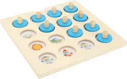 Placă de joc din lemn cu piese din plastic decorate cu imagini cu astronauți, rachete și planete. Servește ca o jucărie educativă pentru dezvoltarea memoriei și abilităților cognitive.