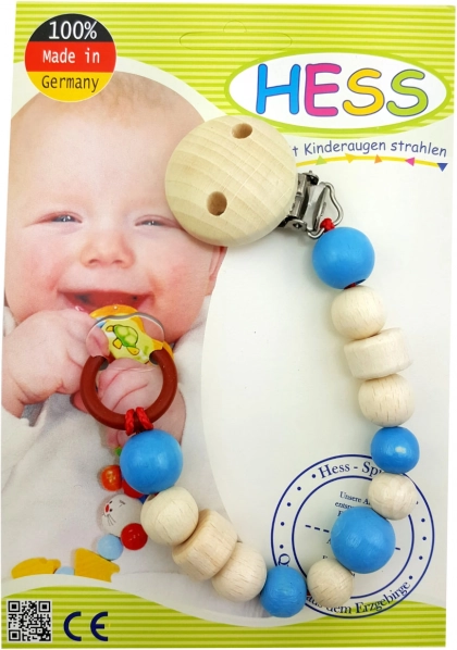 Clemă practică pentru suzetă, în nuanță delicată de albastru deschis, menține suzeta mereu la îndemână și curată. Dispune de clemă metalică pentru prindere sigură de haine și de inel universal din silicon pentru fixarea majorității suzetelor. Fabricată în Germania din lemn de calitate, vopsit cu culori netoxice, rezistente la salivă și transpirație.