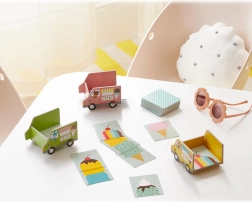 Include cartonașe colorate și căruțe care stimulează imaginația copiilor și îi ajută să recunoască tipare și culori.